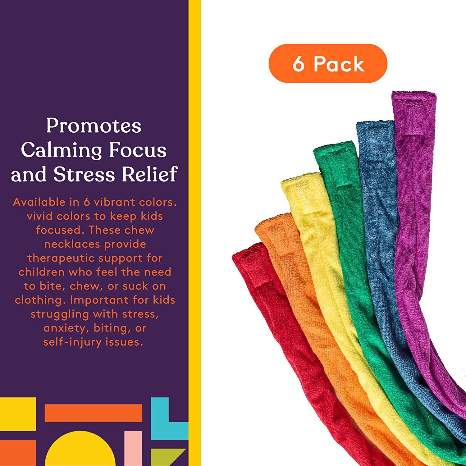 Chew Bands are super absorbent necklaces designed for children who need to chew or bite for calm and focus. Unlike plastic chew necklaces, these terry cloth bite bands soak up drool, keeping shirts dry even after extended periods of chewing. Bite Bands also exercise oral motor and facial muscles to prepare kids for good eating habits. Includes 6 bands. Non-returnable. Use with adult supervision.